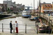 Wattenmeer - Wenn die Flut kommtWie jetzt? Herr Kluthe (Holger Handtke, l.) versteht die Welt nicht mehr. Wieso liegen die Schiffe trocken, wo er doch so eine wichtige Mission hat? Fritz Fuchs (Guido Hammesfahr, r.) erklärt ihm das Geheimnis der Gezeiten.Bild: © ZDF und Antje Dittmann