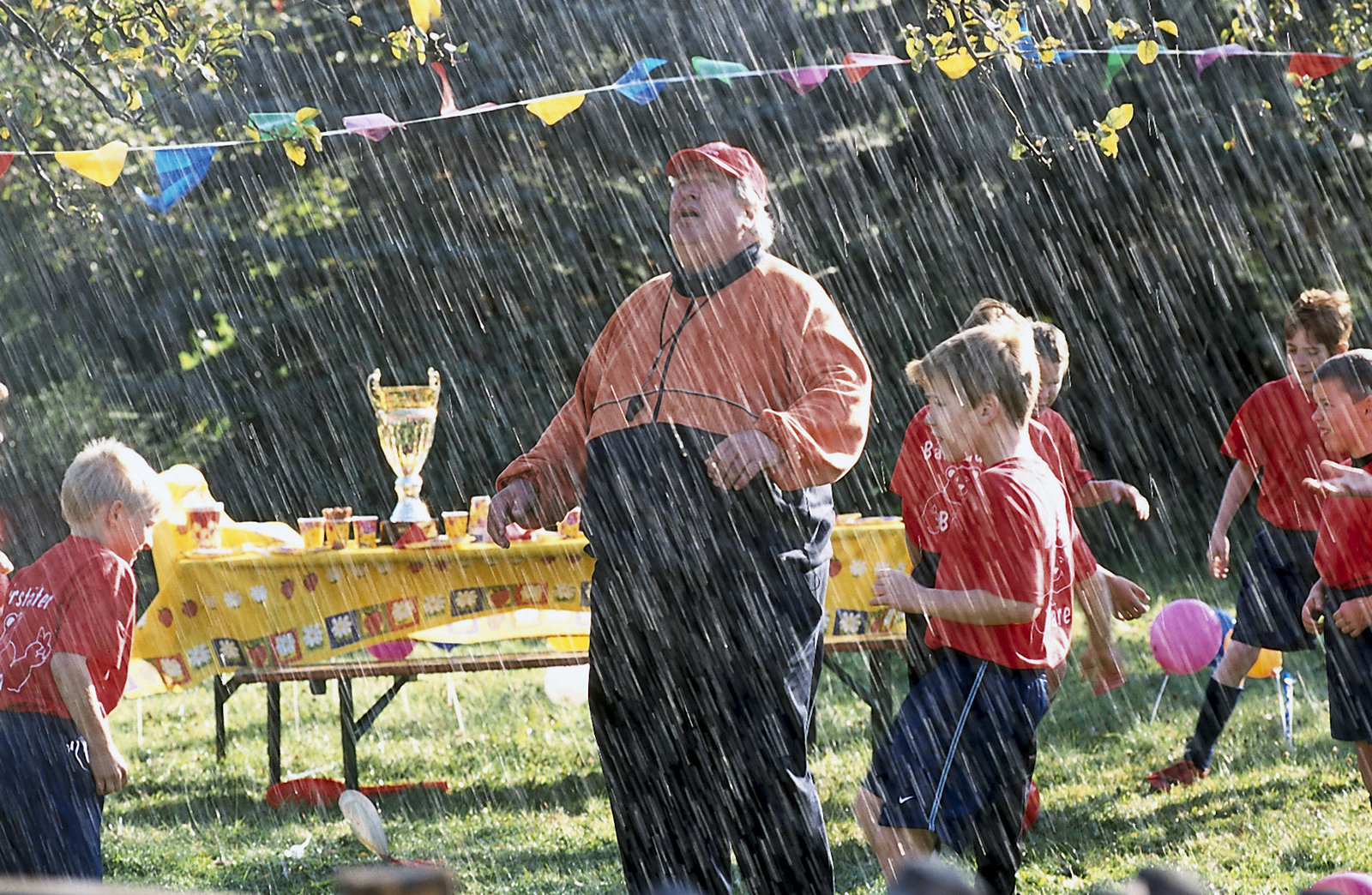 Peter als WetterfroschPlötzlich fängt es an zu regnen. Die Gartenparty für das Fußballteam der "Bärstädter Bären" und Herr Paschulke (Helmut Krauss, M.) fällt doch nicht etwa ins Wasser?Bild: © ZDF und Christiane Pausch