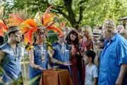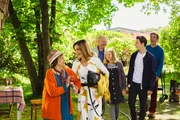 Familie (1) - Die beste BandeFamilienparty zu Ende - sind alle Fragen gelöst? Lachend laufen Suse (Eva Mannschott, 2.v.l.) und Oma Ilse (Urs Conradi, l.) Hand in Hand durch Fritz`s Garten. Ihnen folgen Suses Mann Andi (Nils Düwell, M.), Toni (Heidi Tebroke, 3.v.r.), Jonas (Emil Baikousis, 2.v.r.) und Fritz fuchs (Guido Hammesfahr, r.). Alle sind bester Laune.Bild: © ZDF und Andrea Hansen Fotografie.