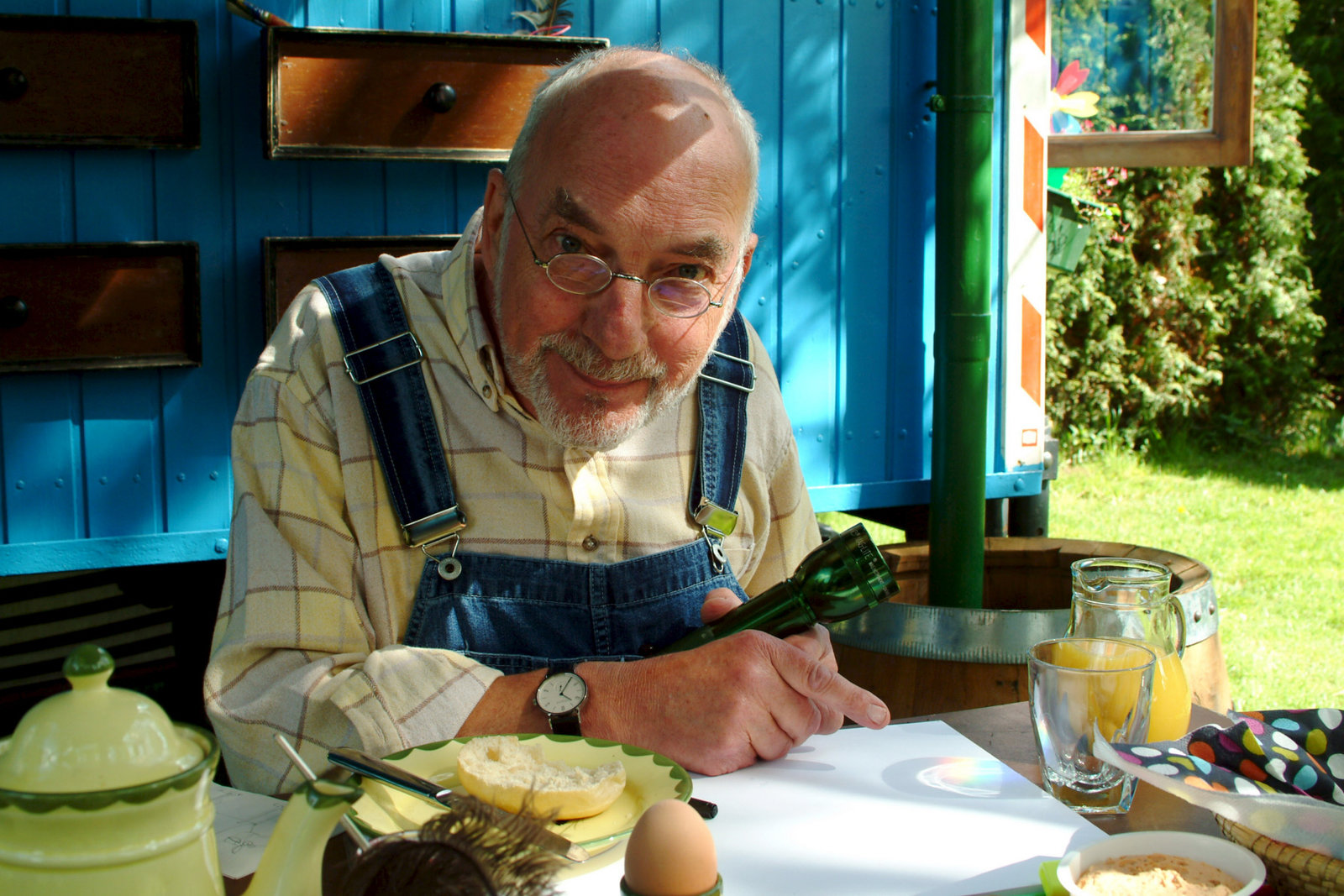 Peter schickt ein Licht ins AllDurch ein Wasserglas bricht das Licht der Sonne. Peter (Peter Lustig) ist von diesem Wunderwerk der Natur ganz begeistertBild: © ZDF und Christiane Pausch