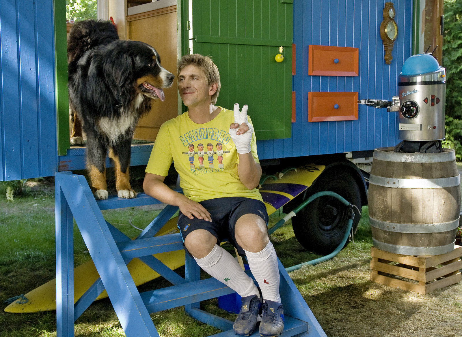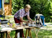 Peter als WetterfroschPlötzlich fängt es an zu regnen. Die Gartenparty für das Fußballteam der "Bärstädter Bären" und Herr Paschulke (Helmut Krauss, M.) fällt doch nicht etwa ins Wasser?Bild: © ZDF und Christiane Pausch