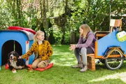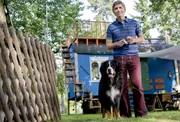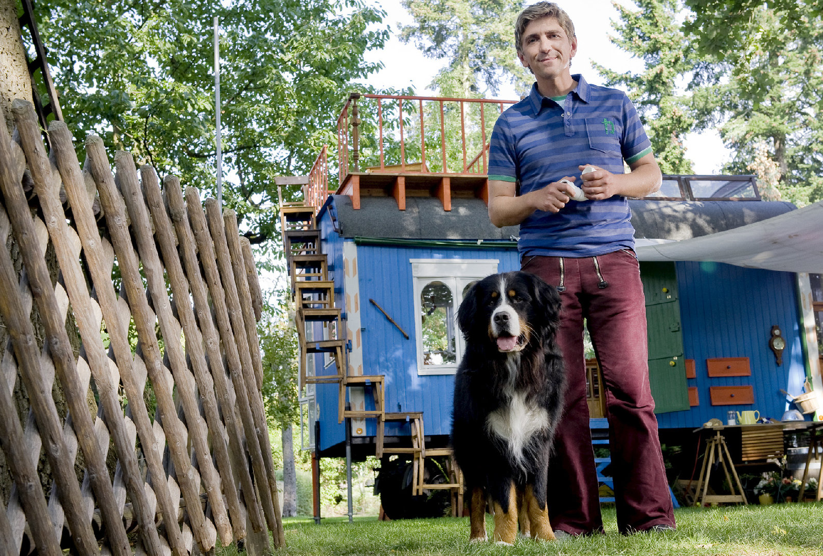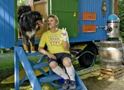 Ratten - Der Fänger von BärstadtFritz Fuchs (Guido Hammesfahr) und Hund Keks vor ihrem Zuhause, dem blauen Bauwagen.Bild: © ZDF und Antje Dittmann