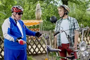 Fahrrad - Verfolgung auf zwei Rädern"Was haben sie aus meinem schönen Fahrrad gemacht, Herr Fuchs?" Fritz (Guido Hammesfahr, re.) und sein Nachbar (Helmut Krauss).Bild: © ZDF und Antje Dittmann