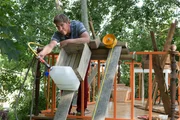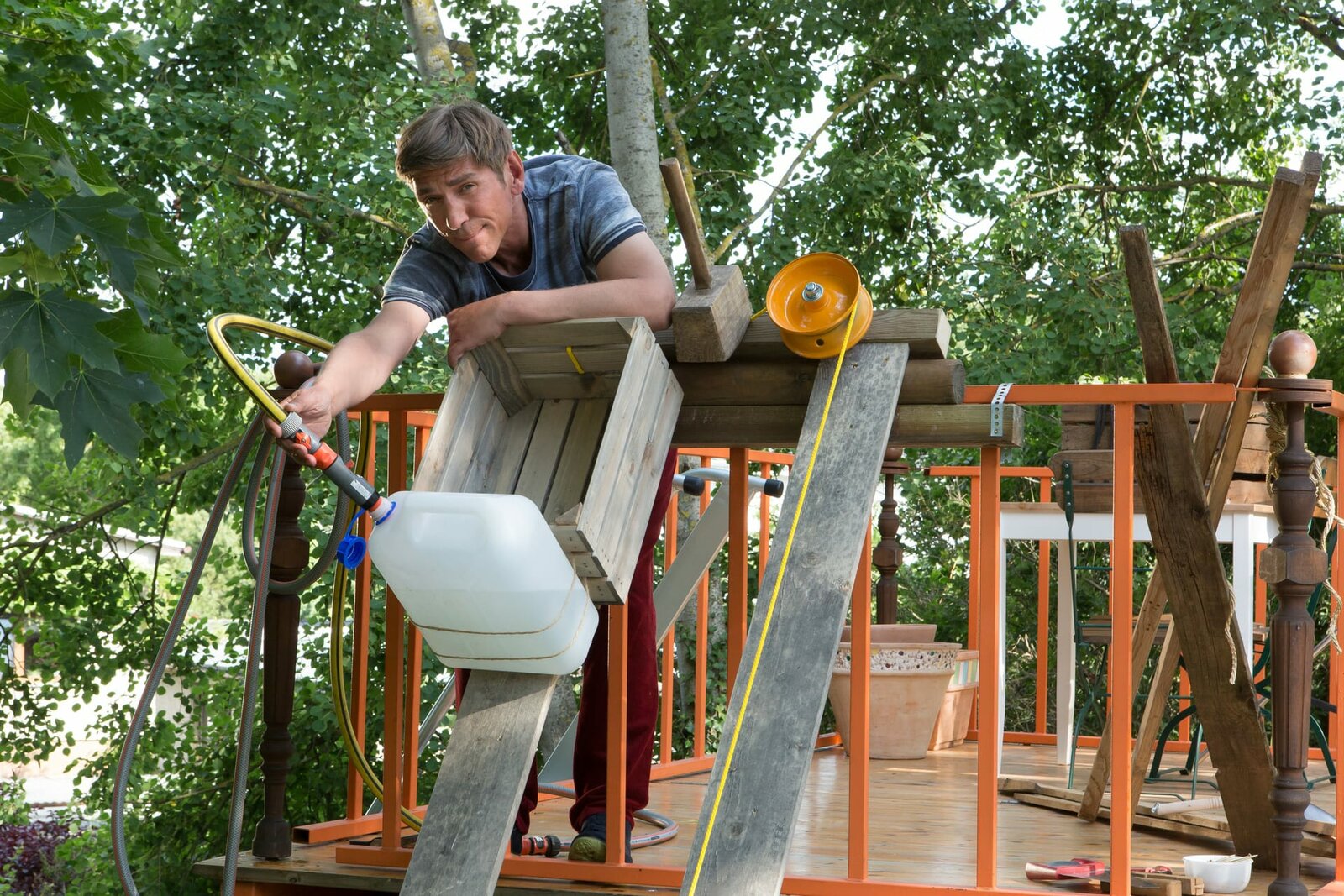 Seilbahn - Über alle HindernisseFritz (Guido Hammesfahr) tüftelt am Bau einer Seilbahn – ganz ohne Strom und nur mit Wasserballast.Bild: © ZDF und Zia Ziarno./Zia Ziarno