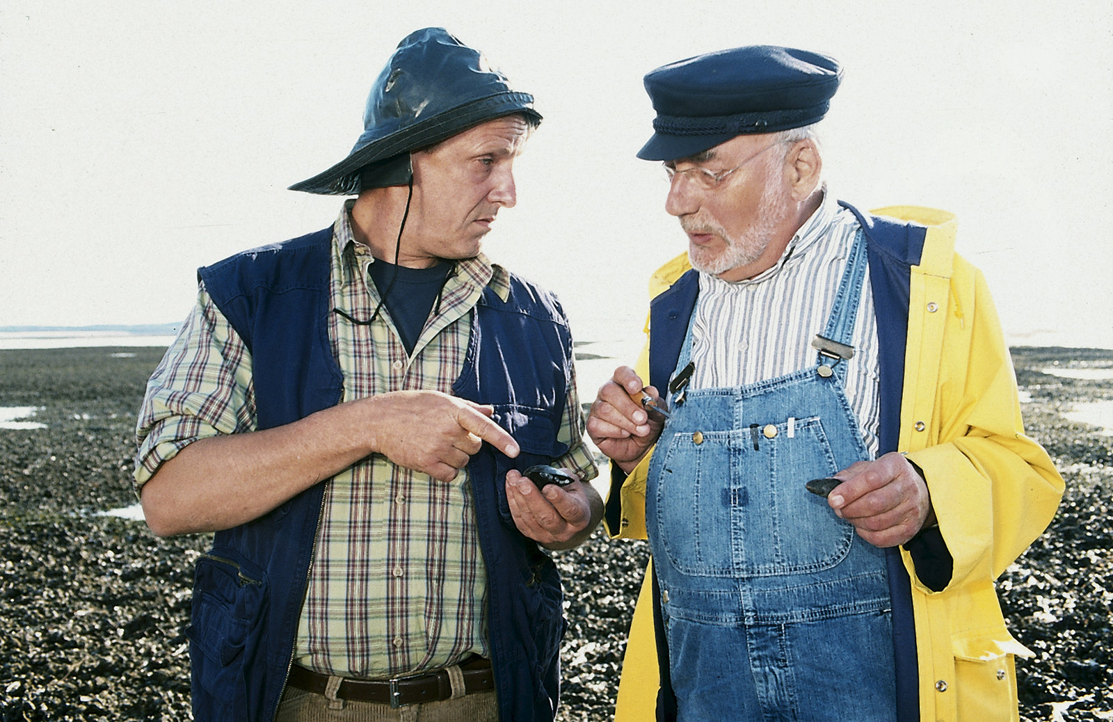 Peter sucht die PerlmuschelDer Fischer (Joachim Lautenbach, l.) erklärt Peter Lustig (Peter Lustig, r.), dass Miesmuscheln auch Perlen enthalten können.Bild: © ZDF und Christiane Pausch