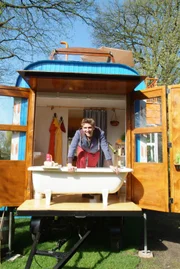 Roboter - Der traumhafte HelferFritz Fuchs (Guido Hammesfahr) und sein Hund "Keks" in ihrem blauen Bauwagen.Bild: © ZDF/Christiane Pausch