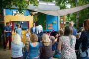Figurenspiel - Die verwunschene PuppeFritz Fuchs (Guido Hammesfahr, l.), sein Freund (Markus Schoenen, r.), Jana (Stella Brückner, 2.v.r.) und Jakob (Arved Friese, 2.v.l.) haben das Publikum begeistert. Sie haben ein grandioses Figurentheaterstück erfunden - in den Hauptrollen ein fieser Zauberer und eine verzauberte Puppe.Bild: © ZDF und Antje Dittmann.