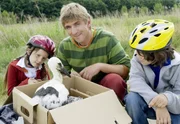 Störche - Nestsuche für den NachwuchsZum Glück ist nicht viel passiert! Fritz Fuchs (Guido Hammesfahr) hat mit Ella (Celine Tanneberger, l.) und Hannes (Bela Baganz, r.) den kleinen Storch gerettet.Bild: © ZDF/Antje Dittmann