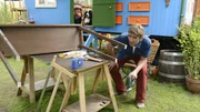 Holz - Der Baum auf dem BüdchenFritz Fuchs (Guido Hammesfahr) kümmert sich um den kaputten Auslagentisch vom Kiosk und will die Beine mit der Stichsäge kurzerhand auf die richtige Länge bringen.Bild: © ZDF und Antje Dittmann