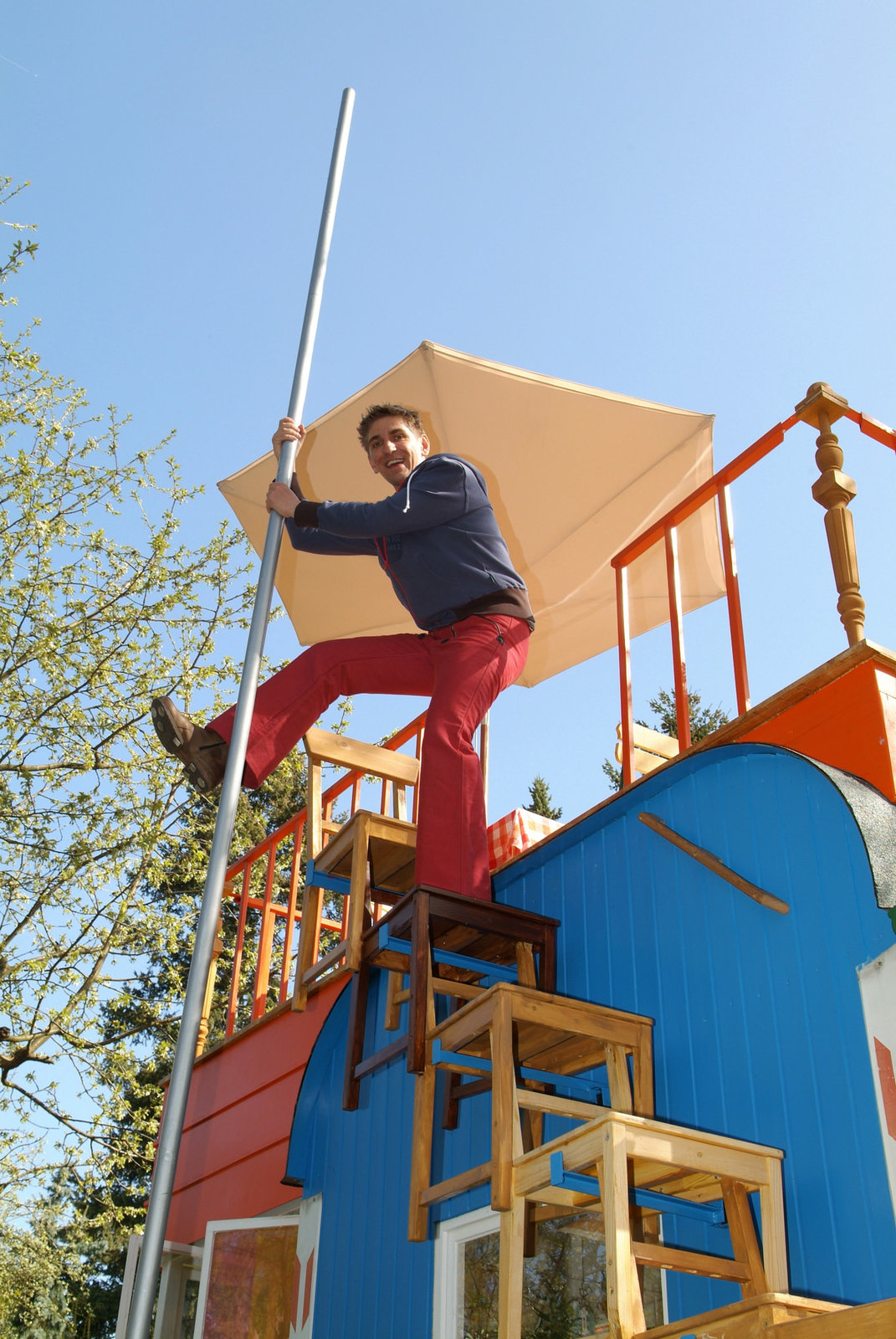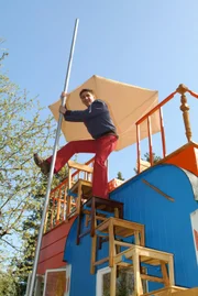 Bienen - Der Raub der HonigmacherBlitzschnell abwärts - an der Stange kann Fritz Fuchs (Guido Hammesfahr) in Windeseile von der Dachterrasse des Bauwagens herunterrutschen.Bild: © ZDF/Christiane Pausch