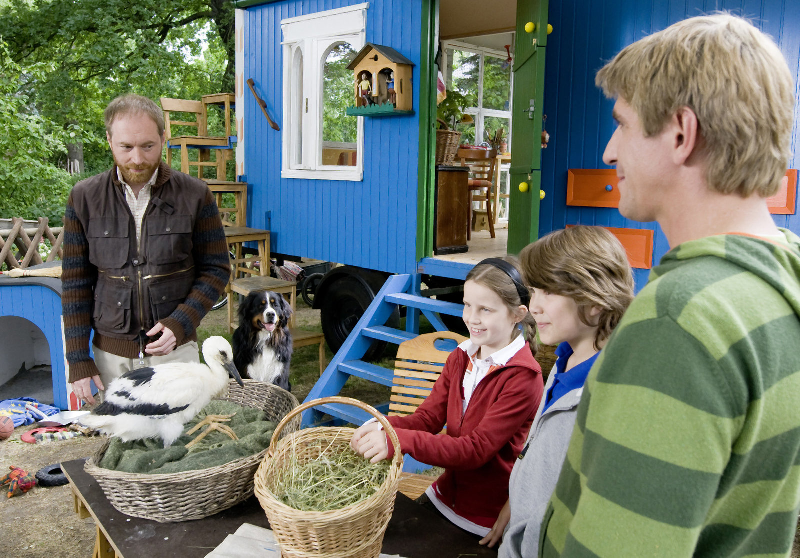 Störche - Nestsuche für den NachwuchsFritz Fuchs (Guido Hammesfahr) und die Kinder (Celine Tanneberger und Bela Baganz) haben den kleinen Storch gerettet. Nun kann er auf den Storchenhof gebracht werden. (li.: Rainer Sellien)Bild: © ZDF/Antje Dittmann