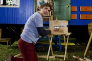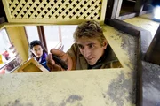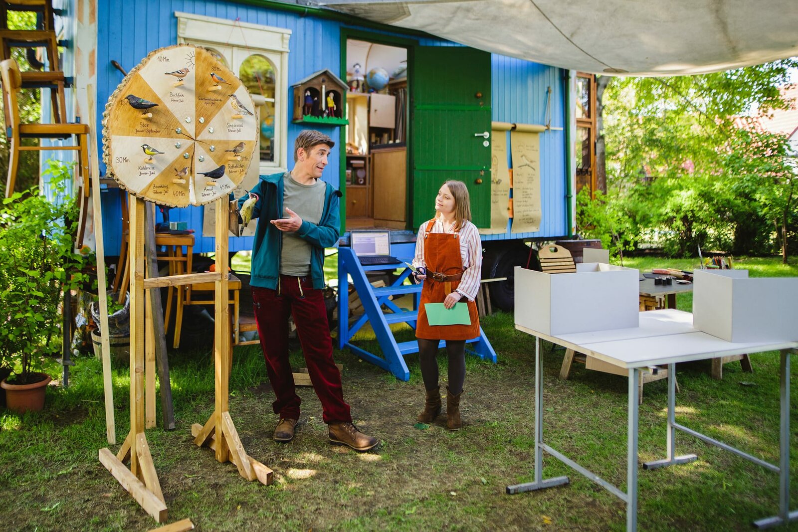 Uhren - Wettlauf gegen die ZeitFritz Fuchs (Guido Hammesfahr, r.) zeigt Yasemin (Sanam Afrashteh, l.) seine neuesten Erfindungen an dem Bauwagen.Bild: © ZDF und Antje Dittmann