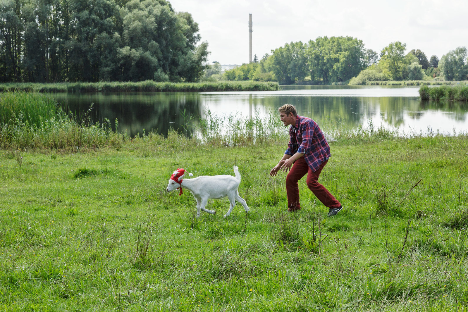 Ziege - Die verrückte EntführungFritz Fuchs (Guido Hammesfahr) versucht, Ziege Rosalie einzufangen. Sie soll die nächsten Tage bei ihm wohnen, damit er sie vor den Entführern beschützen kann.Bild: © ZDF und Antje Dittmann