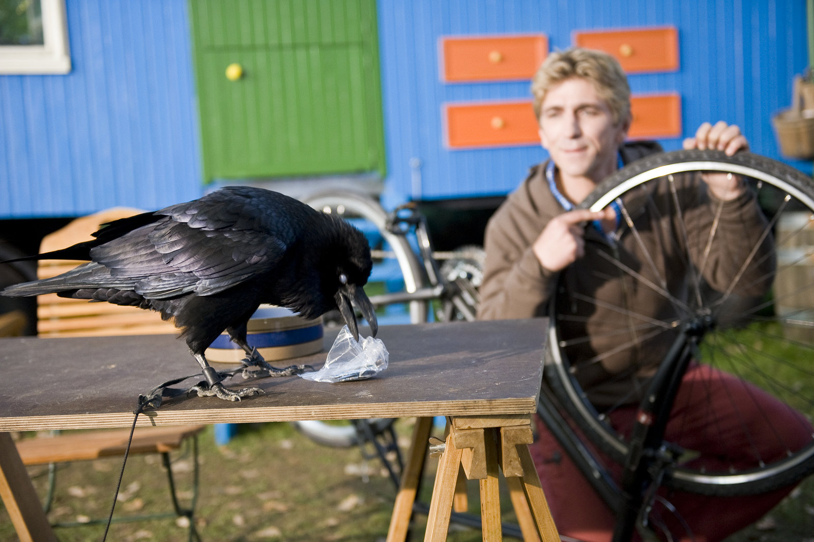 Raben - Rätselhafte RufeHe, der freche Rabe klaut Fritz Fuchs (Guido Hammesfahr) das Fahrradflickzeug.Bild: © ZDF und Antje Dittmann