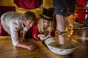Gold - Der glänzende TraumWittenborn (Bernhard Geffke, li.) verpachtet das Land am Fluss Bärlau und hat noch so einige findige Geschäftsideen, für die Suse (Eva Mannschott) und Fritz (Guido Hammesfahr) viel Geld ausgeben.Bild: © ZDF/Antje Dittmann