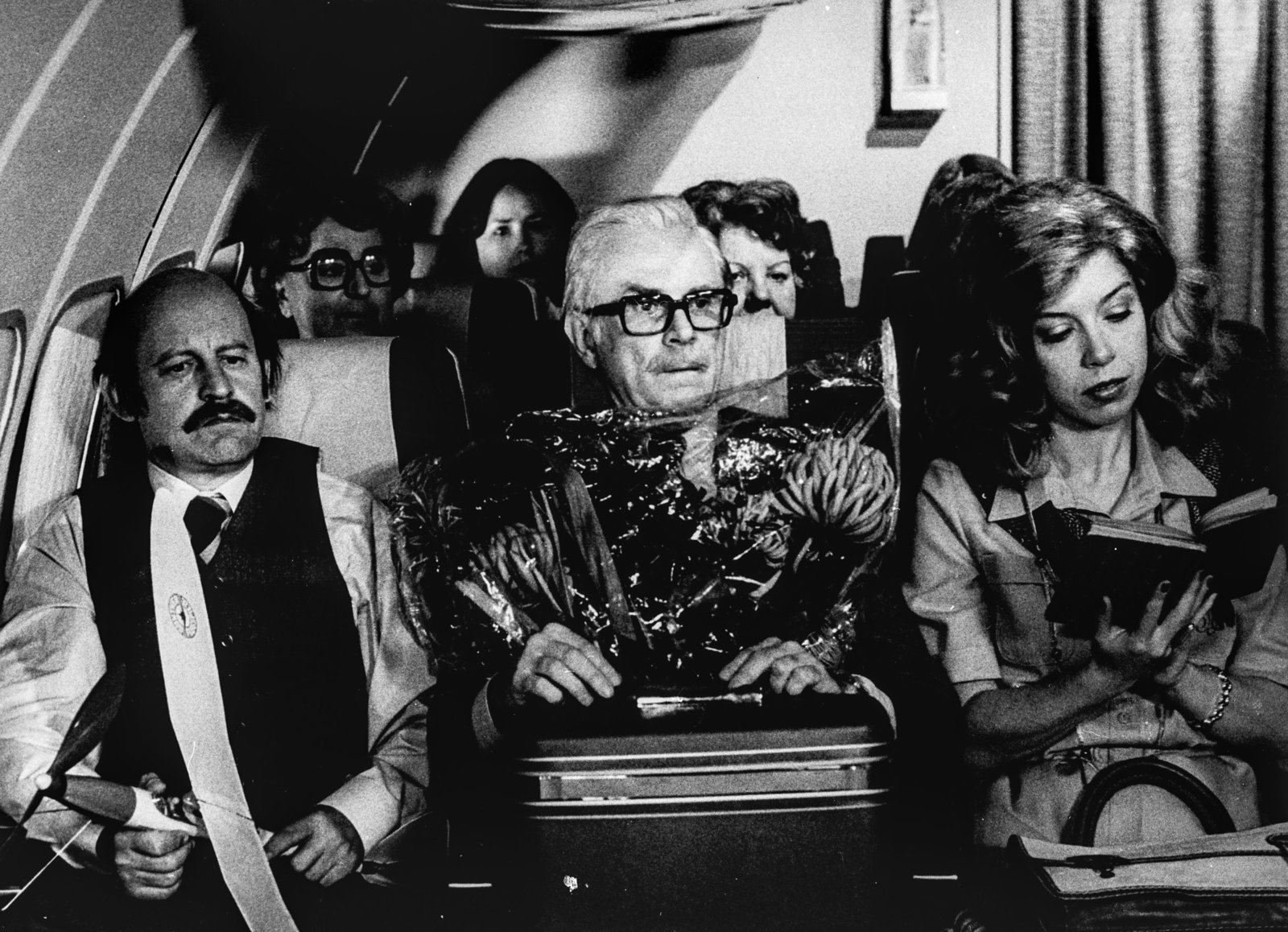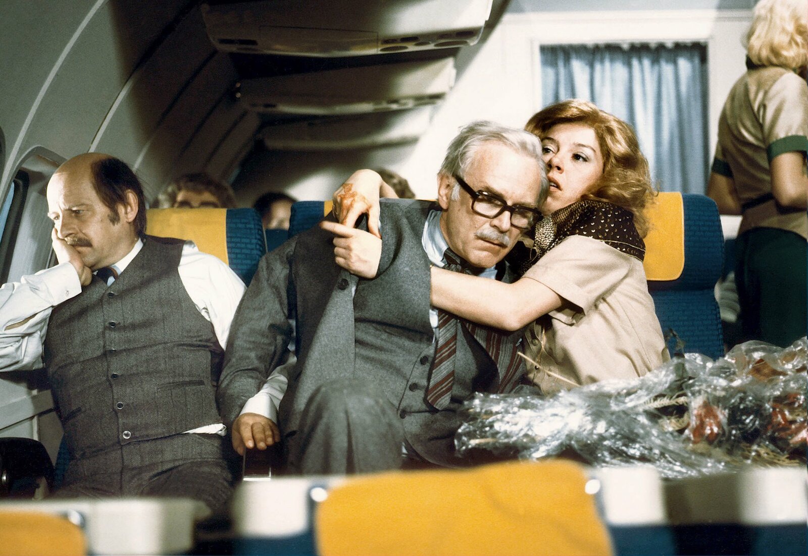 Alles über das Fliegen"Menschliche Nähe" ist beim Fliegen geradezu unvermeidlich. Vor allem der Versuch, dem Mitreisenden beim Wechseln der Kleidung behilflich zu sein, kann zu Situationen führen, die unter normalen Bedingungen als nicht mehr korrekt bezeichnet würden (v.l.n.r. Heinz Meier, Loriot und Evelyn Hamann).Bild: © Radio Bremen