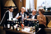 Weihnachten bei HoppenstedtsVertreterbesuch - Normalerweise werden Vertreter von deutschen Hausfrauen gleich an der Haustür abgefertigt. Aber in der Vorweihnachtszeit kann es passieren, dass eine unvoreingenommene Hausfrau das traurige Los von Außendienstmitarbeitern mit Imbiss und Umtrunk mildert. Frau Hoppenstedt jedenfalls fühlt sich wohl im Kreis von drei Herren aus der Staubsauger-, Wein- und Versicherungsbranche. (v.l.n.r. Rudolf Kowalski, Loriot, Kurt Ackermann, Evelyn Hamann)Bild: © SWR/Radio Bremen