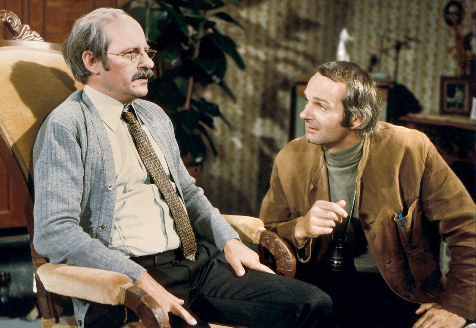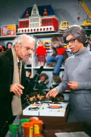Vom Jodeln, Flöten, Pfeifen, Fiedeln - Von Küssen und KosakenzipfelnFrau Hoppenstedt (Evelyn Hamann) sucht ihr Glück nicht allein in ihren Hausfrauen- und Mutterpflichten, nein, sie baut sich nebenher eine berufliche Laufbahn auf, die so einmalig ist, dass sich sogar das Fernsehen dafür interessiert (rechts Loriot).Bild: © Radio Bremen/Do Leibgirries