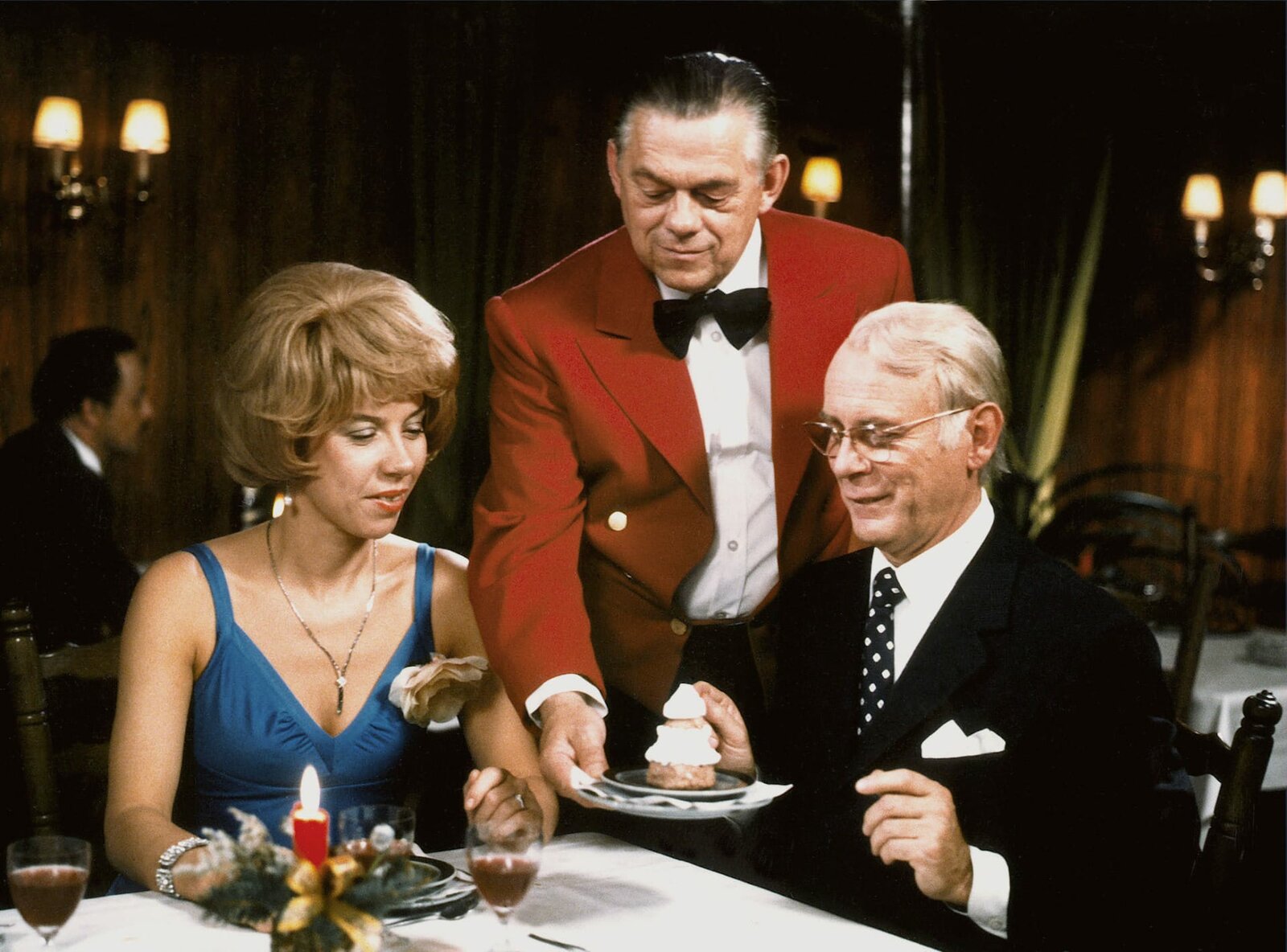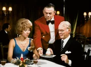Ein Menue mit englischer Zunge, Kalbshaxe, Frühstück, Badewanne und PolitikGeschäftsführer und Oberkellner (Erwin Wirschaz, Heinz Meier) sind fassungslos. Da haben sie sich alle Mühe gegeben, ihre Gäste zufrieden zustellen und trotzdem muß sich einer beschweren (Loriot, rechts). Ist das ein Querulant oder gibt es wirklich etwas zu beanstanden?Bild: © Radio Bremen