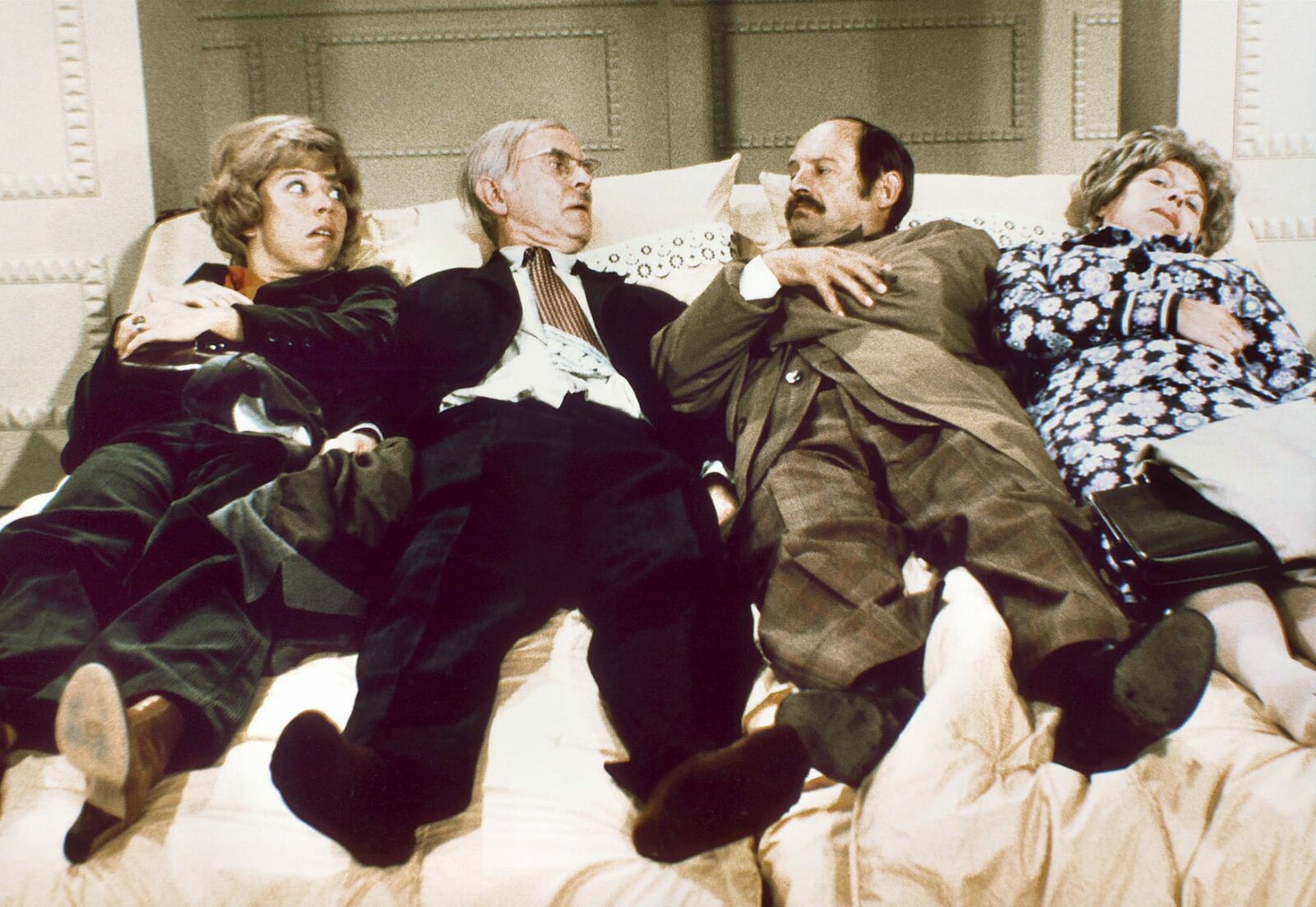 Von Mensch und Musik, Bett, Bratfett und GeselligkeitDer Kauf eines neuen Ehebettes will sorgfältig geplant sein. Auf jeden Fall gehört ein ausgiebiges "Probeliegen" im Bettengeschäft dazu. Schwierig wird es allerdings,wenn sich zwei Paare für ein und dasselbe Bett interessieren. (V.l.n.r. Evelyn Hamann, Loriot, Heinz Meier, Ingeborg Heydorn)Bild: © NDR/Radio Bremen