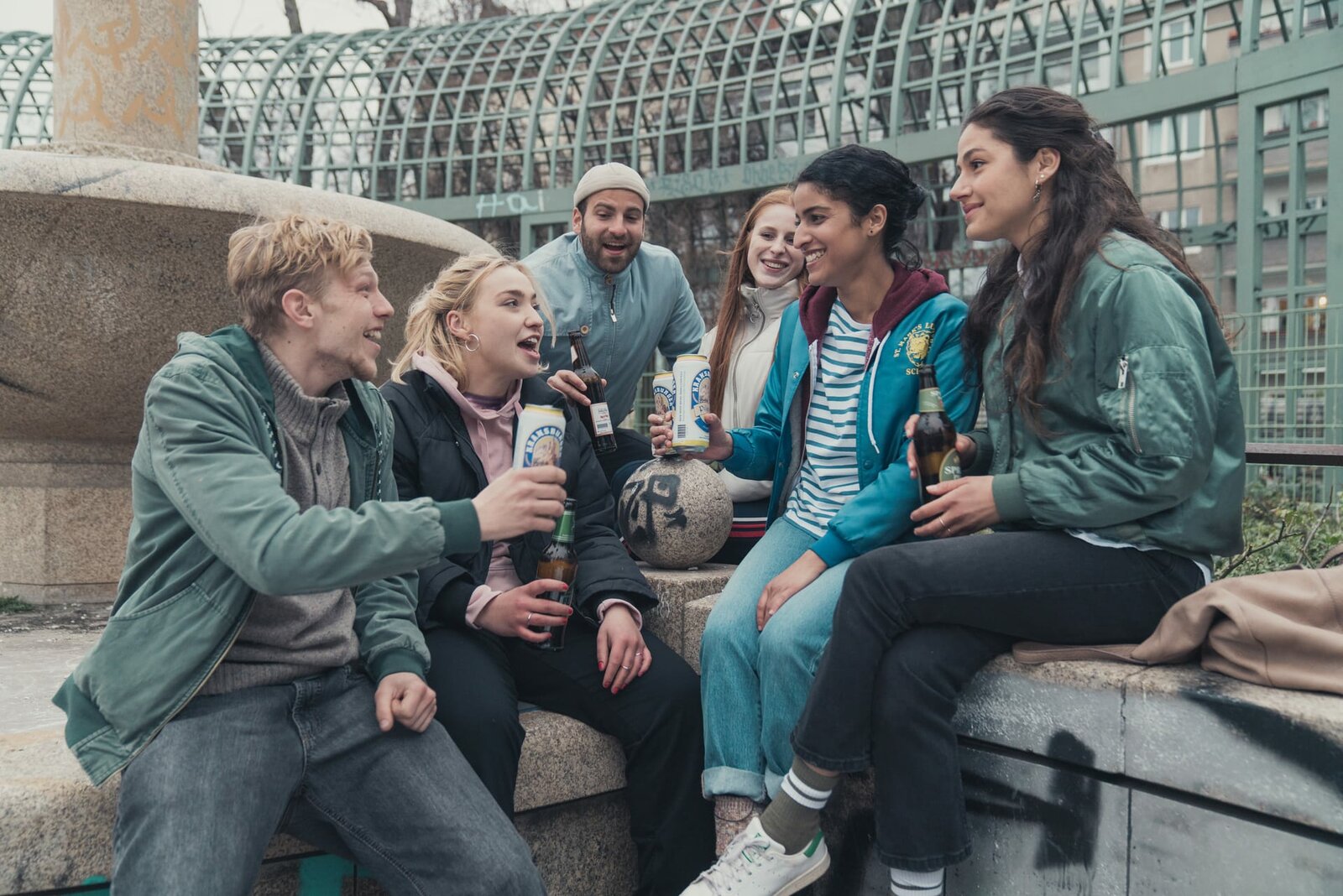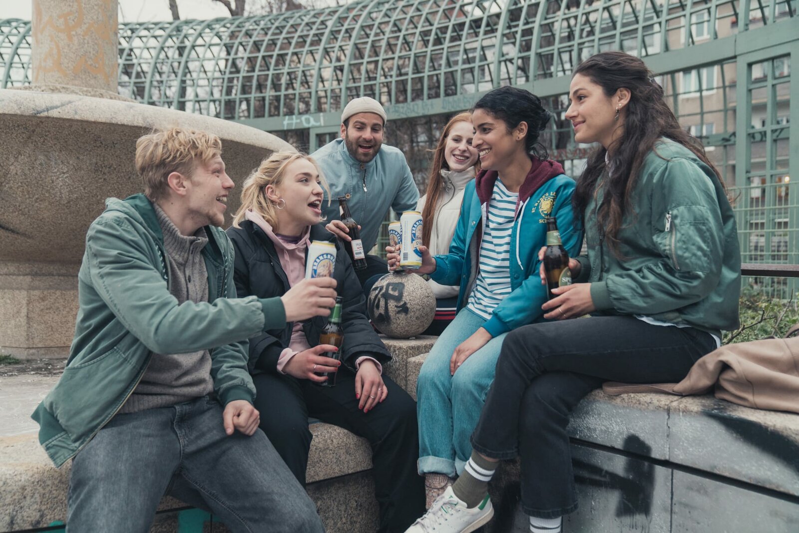 Loving FranziHanna (Banafshe Hourmazdi, l.) genießt ihre Freiheit. Gemeinsam mit ihren Freunden Holly (Bineta Hansen, 2.v.l.), Tobi (Leonard Kunz, 2.v.r.) und Marcus (Arne Kertesz, r.) macht sie die Berliner Klubs unsicher.Bild: © ZDF und Marcus Glahn.