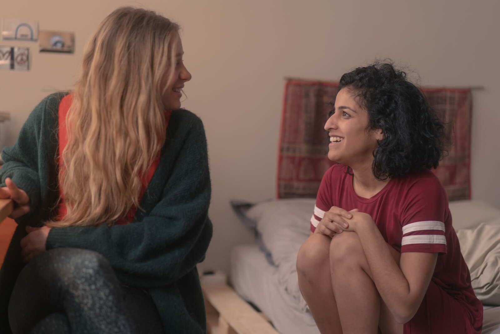 Loving FranziHanna (Banafshe Hourmazdi, r.) versucht ihre Freundin zu einem gemütlichen Tag im Bett zu überreden. Doch Franzi (Lena Klenke, l.) muss lernen und vertröstet Hanna.Bild: © ZDF und Marcus Glahn.