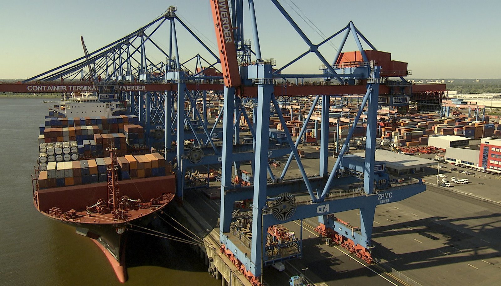 Hapag-Lloyd: Aus Hamburg in die WeltDie „Essen Express“ am Containerterminal Altenwerder. Mit 13.200 Standardcontainern gehört das Schiff zur größten Schiffsklasse von Hapag-Lloyd.Bild: © phoenix/NDR/doc.station