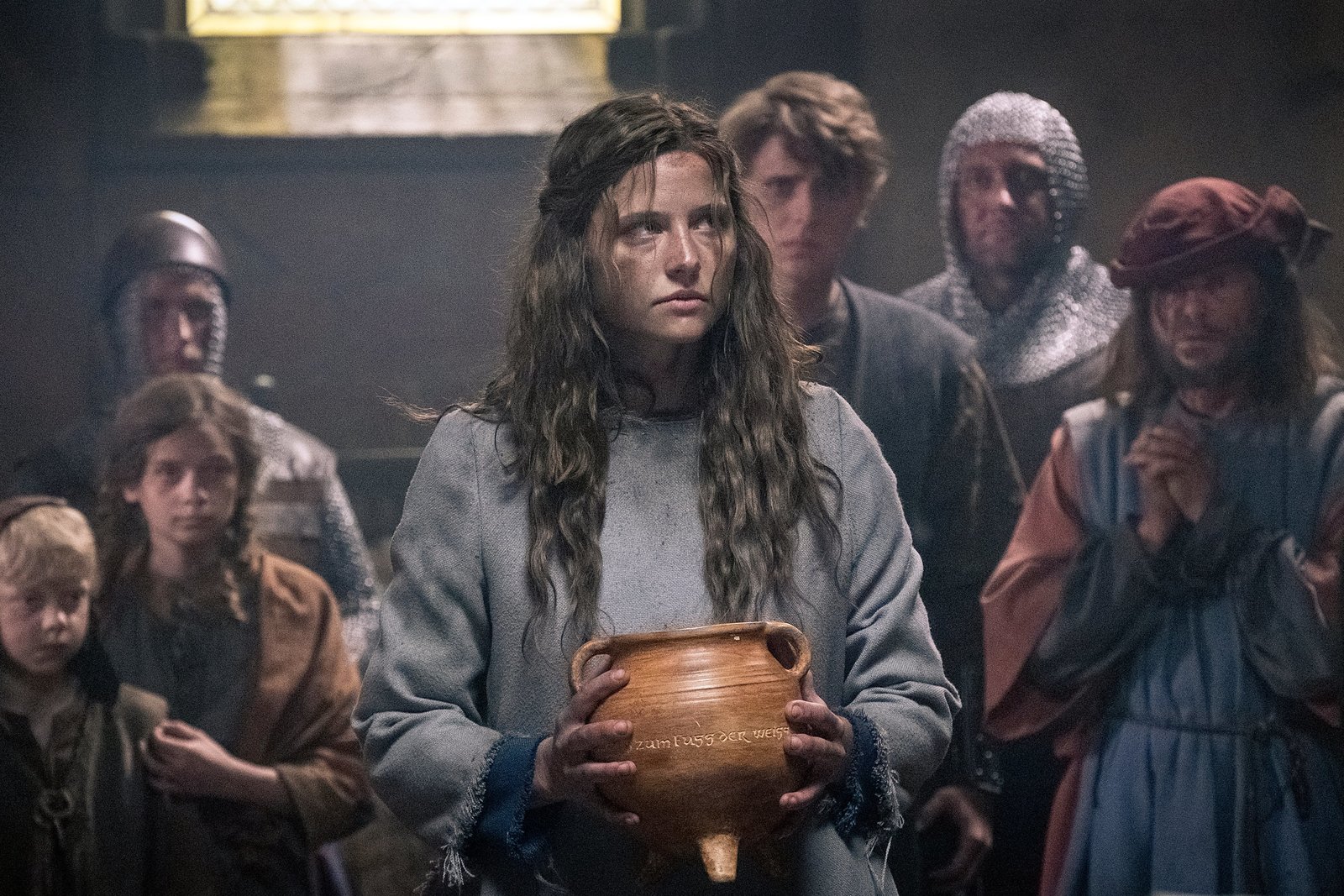 Der süße BreiDer Topf, der süßen Brei kocht, könnte viele hungrige Münder füllen. Im Vordergrund Jolanthe (Svenja Jung), im Hintergrund ihre Geschwister Simon (Benjamin Ahrens) und Hedwig (Mariella Aumann) sowie Veit von Hammerlitz (Merlin Rose), Hauptmann Lenhart (Marko Dyrlich) und Lars Rudolph als Balduin.Bild: © ZDF und Anke Neugebauer/Kinderfilm GmbH.