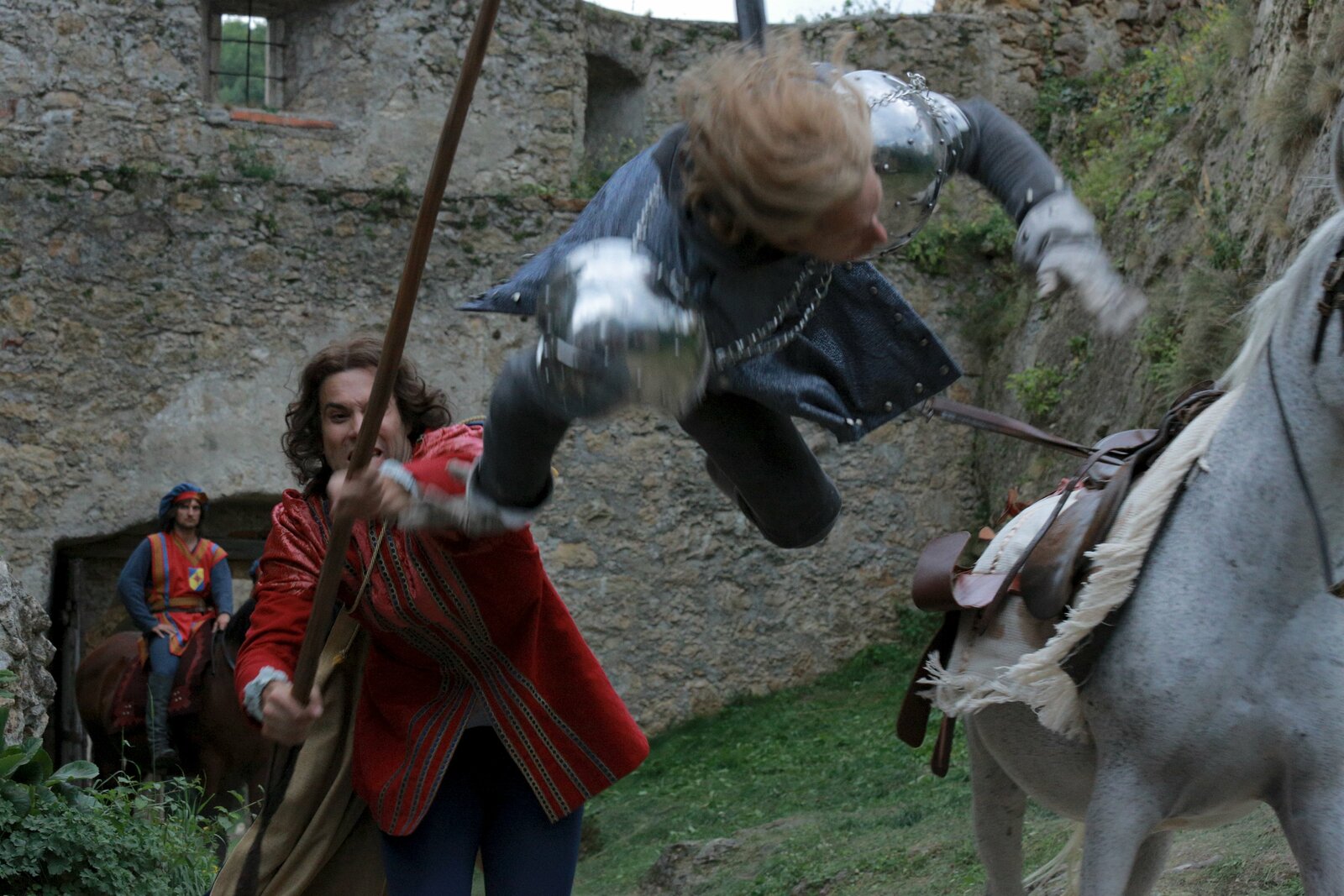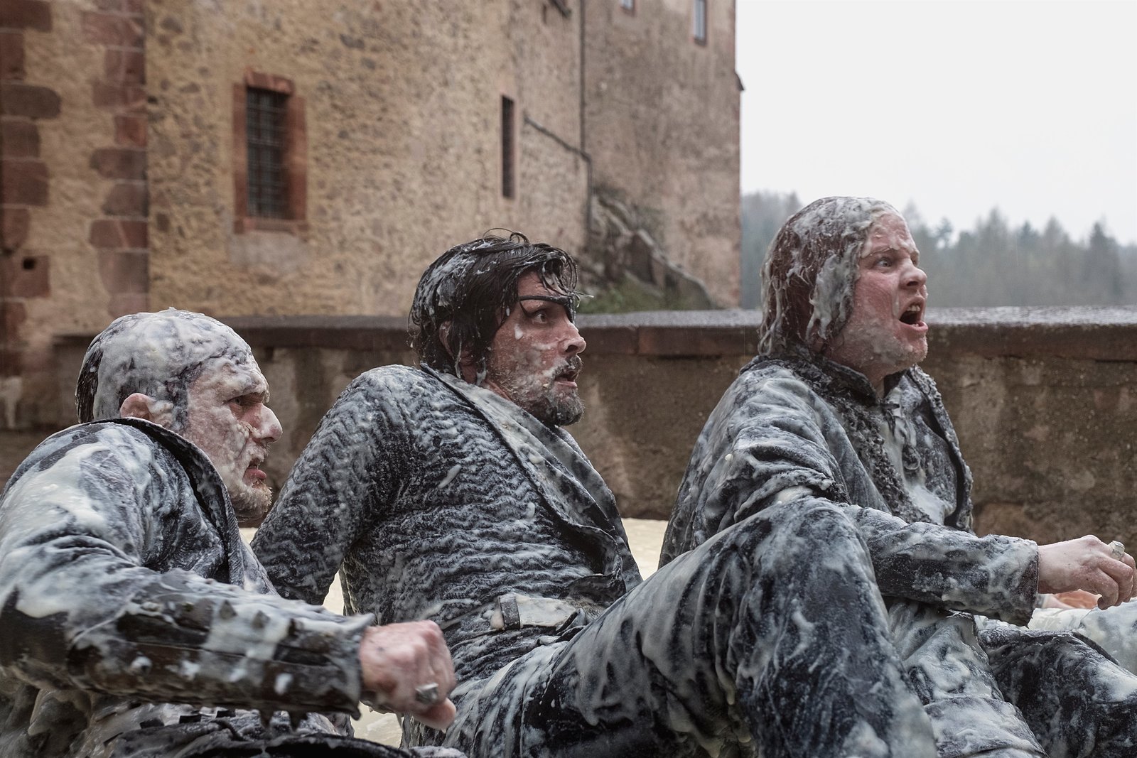 Der süße BreiNur für die Guten ist der Brei eine süße Erfahrung (V.l.n.r.: Martin Winkelmann und Stipe Erceg als die beiden Geldeintreiber „Nase“ und „Schwarzrabe“ sowie Roland Wolf als „Graf Ruben von Hammerlitz“).Bild: © ZDF und Anke Neugebauer/Kinderfilm GmbH.