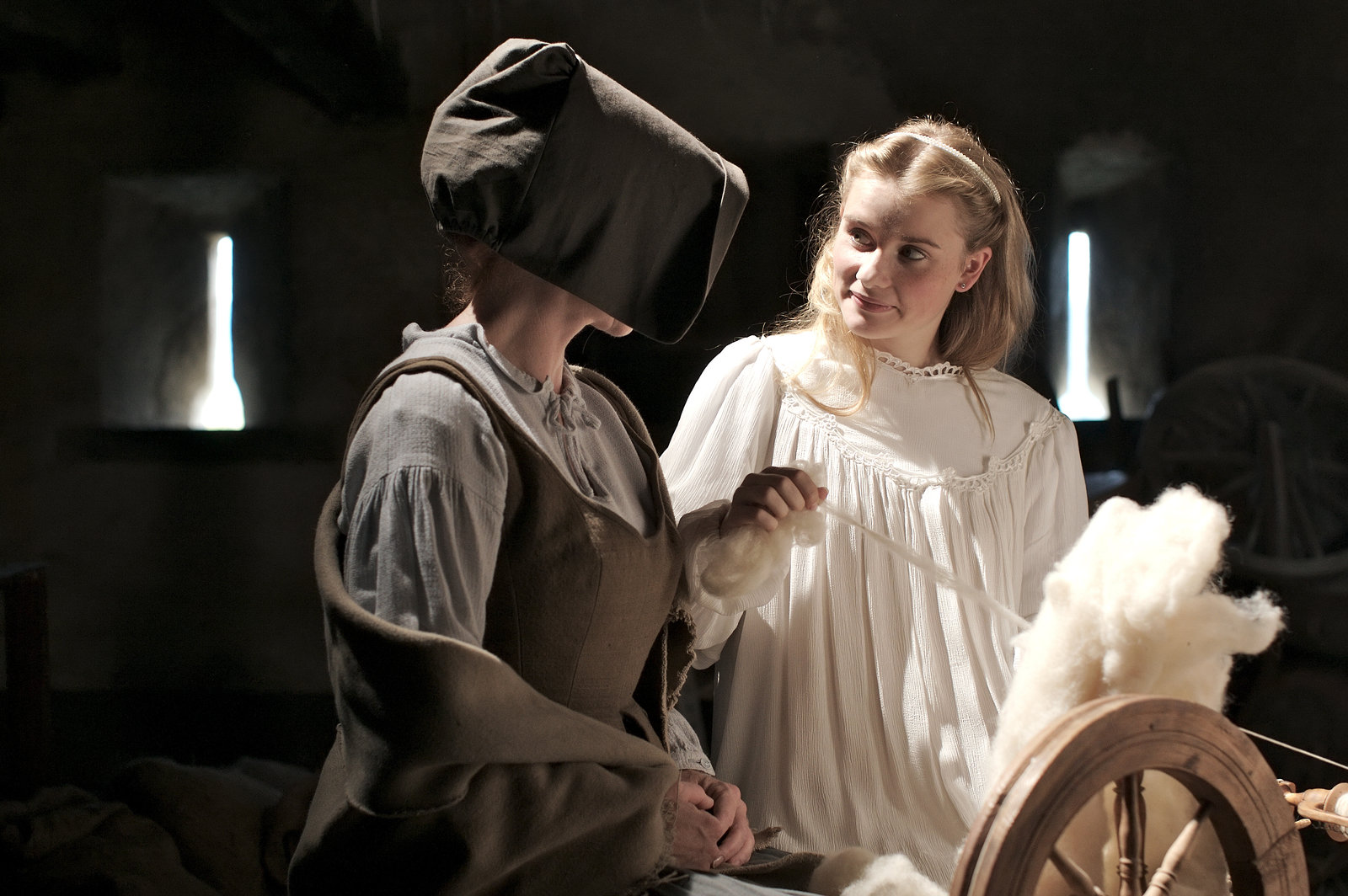 DornröschenDornröschen (Anna Hausburg) lässt sich von der bösen Fee (Nicole Spiekermann) erklären, wie sie das Spinnrad bedienen muss.Bild: © ZDF und Christian Schneider
