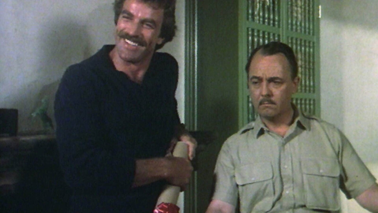 Anschlag auf Robin MastersMagnum (Tom Selleck, li.) befreit den unter Drogen stehenden Higgins (John Hillerman) aus den Händen seiner Entführer.Bild: © MG RTL D / Universal