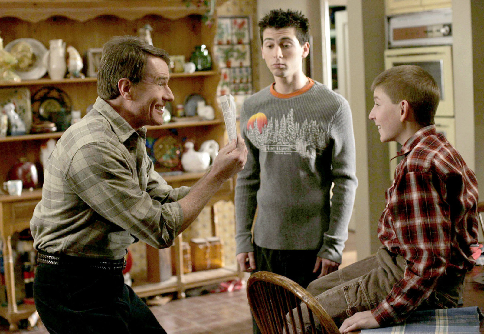 Idas FreundHal (Bryan Cranston, hinten l.), Dewey (Eric Per Sullivan, vorne r.) und Reese (Justin Berfield, vorne l.) finden die Idee, dass Oma Ida nach Hongkong ziehen will, ausgesprochen gut ...Bild: © TM + © 2000 Twentieth Century Fox Film Corporation. All Rights Reserved. Lizenzbild frei