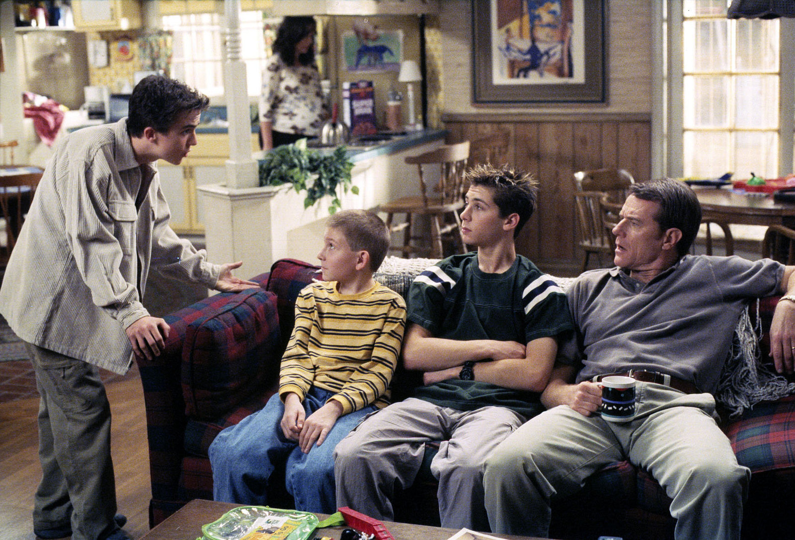 Hallo, Baby! (2)Von links: Malcolm (Frankie Muniz), Reese (Justin Berfield), Dewey (Erik Per Sullivan), Hal (Bryan Cranston) und Lois (Jane Kaczmarek)Bild: © ViacomCBS