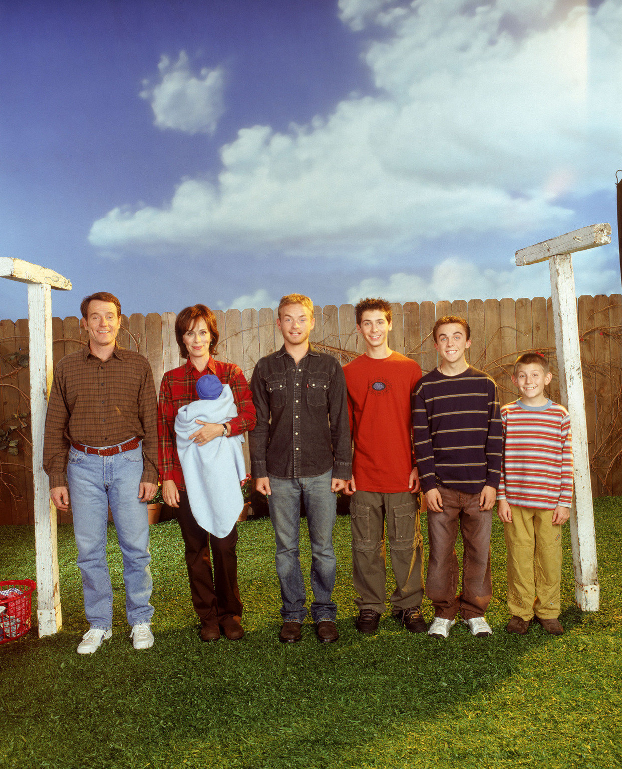 Das Versprechen(6. Staffel) - So friedlich beisammen ist die Familie nur selten: Vater Hal (Bryan Cranston, l.), Mutter Lois (Jane Kaczmarek, 2.v.l.) und ihre vier Söhne Francis (Christopher Masterson, 3.v. l.), Reese (Justin Berfield, 3.v.r.), Dewey (Erik Per Sullivan, r.) und Malcolm (Frankie Muniz, 2.v.r.) ...Bild: © TM + © 2000 Twentieth Century Fox Film Corporation. All Rights Reserved. Lizenzbild frei