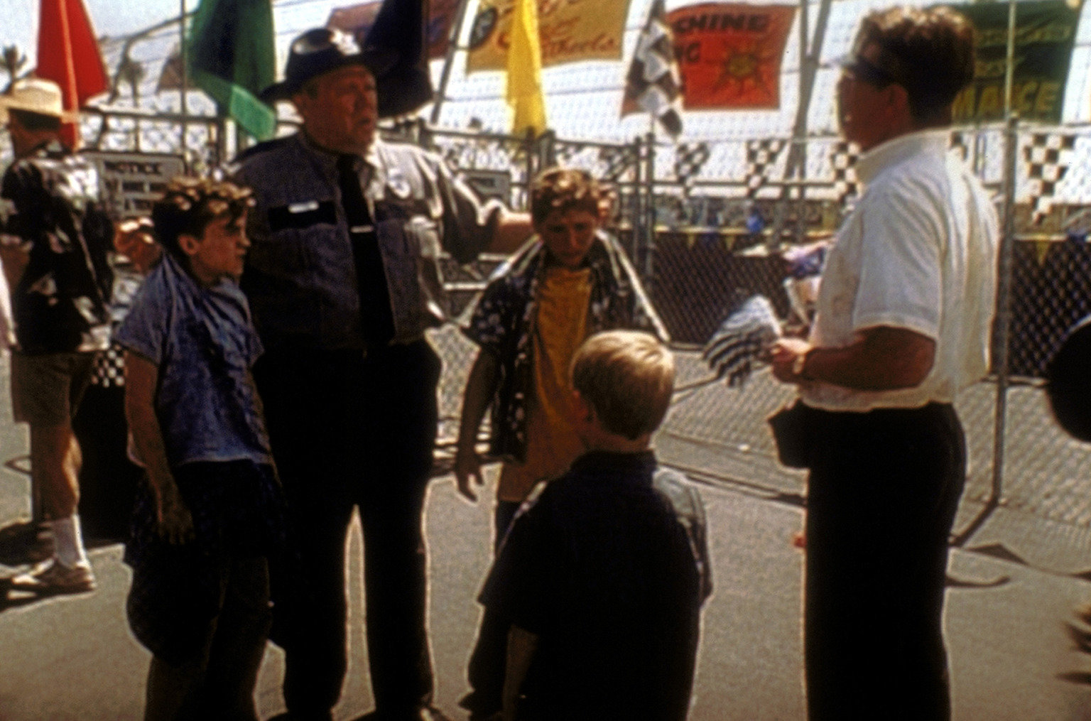 Stock-Car-RennenOfficer Karl (Joel Mckinnon Miller, 2.v.l.) erzählt Hal (Bryan Cranston, r.), was Malcolm (Frankie Muniz, l.) und Reese (Justin Berfield, 2.v.r.) angestellt haben.Bild: © 20th Century Fox Lizenzbild frei
