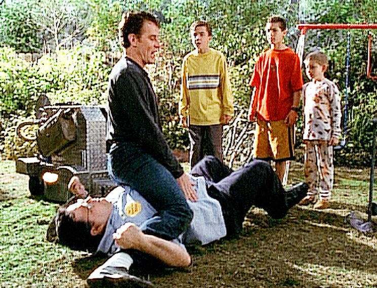 Der Killer-RoboterHal (Bryan Cranston) verprügelt Craig (David Higgins, liegend), nachdem der ihn beleidigt hat. Dewey (Erik Per Sullivan, re.), Reese (Justin Berfield, 2.v.re.) und Malcolm (Frankie Muniz) sehen erstaunt zu.Bild: © ORF
