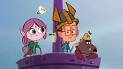 Das GeisterschiffAuf dem Ausguck des Schiffes hat Marcus (M.) eine Idee. Ephi (l) und Ratrick (r.) sind skeptisch, Lumi (oben) freut sich.Bild: © ZDF/Mondo TV France
