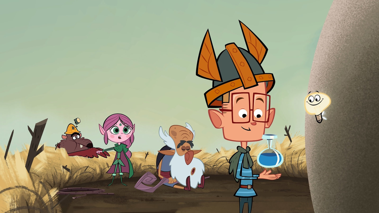 Der DruideMarcus (vorne), Ratrick, Ephi und der Druide (von l.) haben es auf die Felsplattform geschafft und Marcus hat den Heiltrank hergestellt.Bild: © ZDF/Mondo TV France