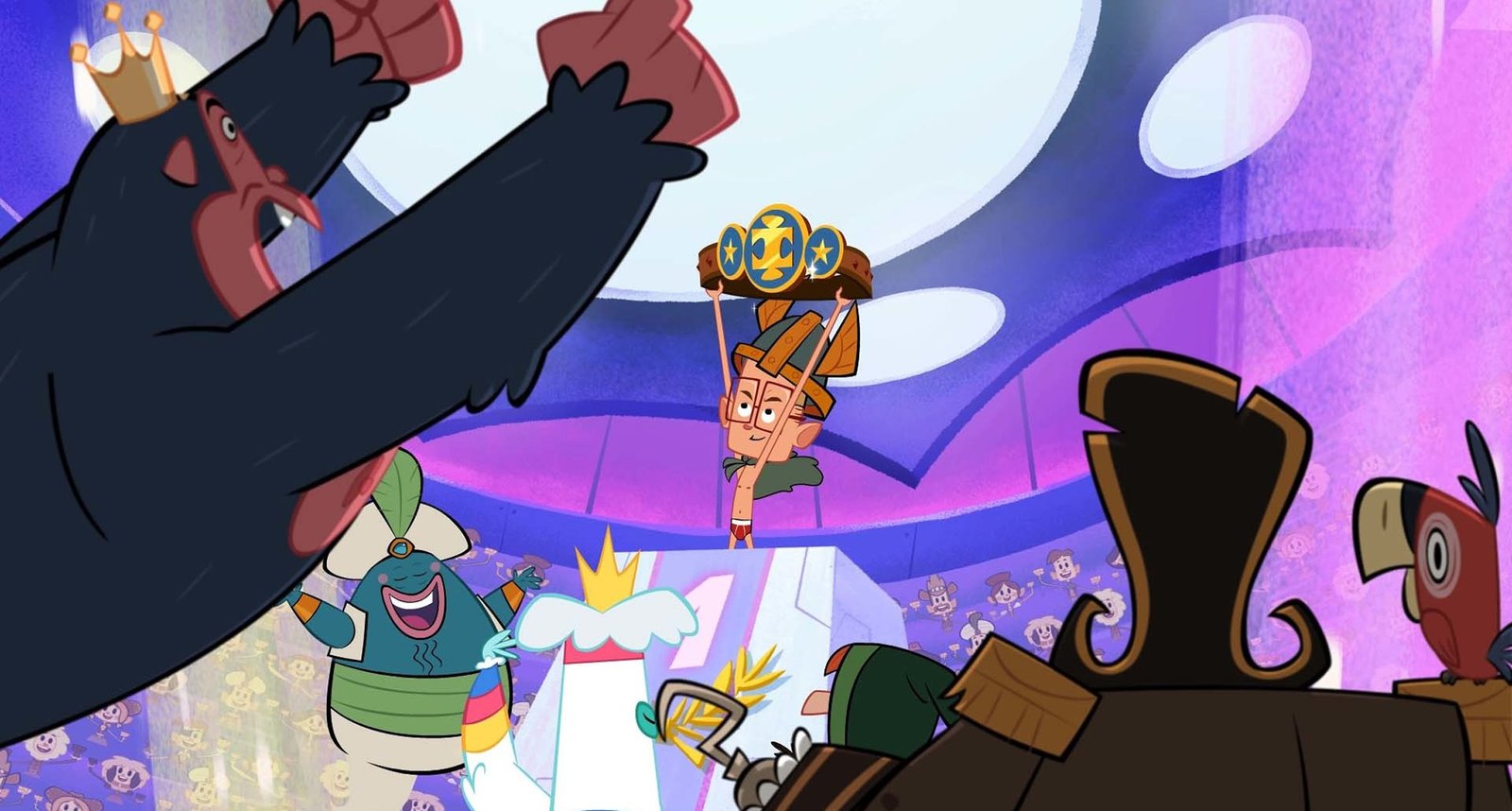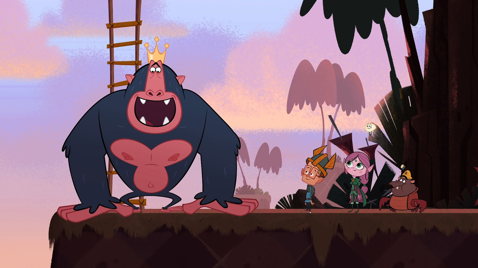 Die PechvögelDer Affenkönig ist glücklich. Marcus (l.), Ephi (M.) und Ratrick (r.) haben ihm helfen können.Bild: © ZDF/Mondo TV France