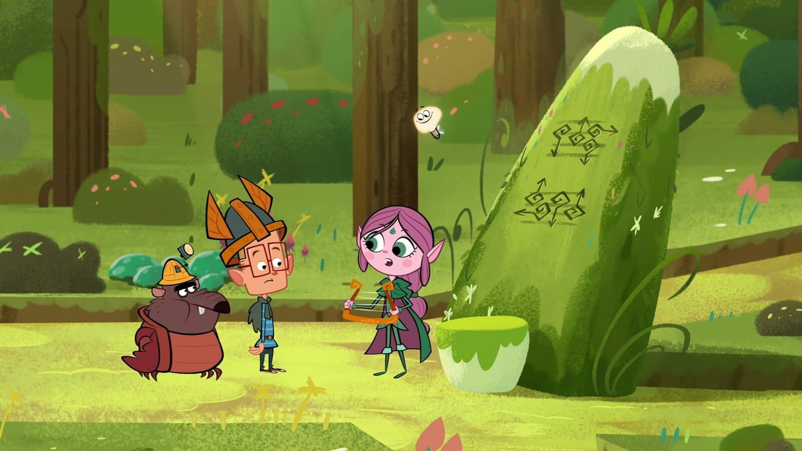 Tanz mit VipkradEphi (r.) erklärt Marcus (M.) und Ratrick, was es mit der Harfe und der Hymne der Elfen auf sich hat.Bild: © ZDF/Mondo TV France