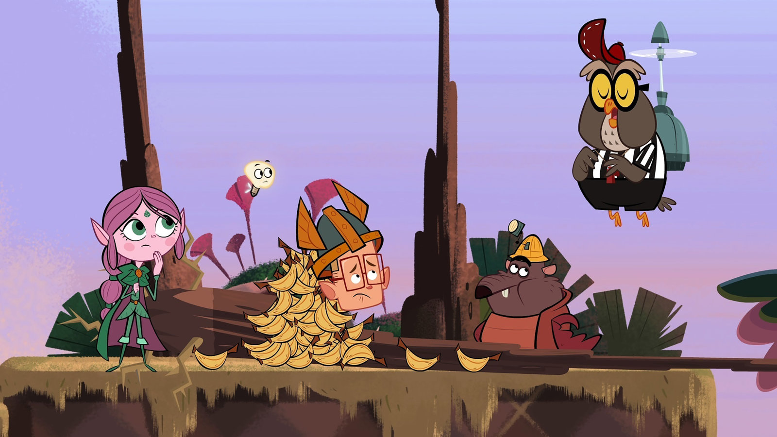 Die PechvögelMarcus (2.v.l.) hat eine volle Ladung Bananen abgekriegt und fragt sich, ob er vom Pech verfolgt ist. Ephi (l.), Ratrick (2.v.r.) und Hugo (r.) wundern sich.Bild: © ZDF/Mondo TV France