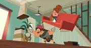 Ratrick, der HeldGorbar (l.) hat Kater Maurice unter dem Sofa hervorgefischt, indem er das Sofa mit Babysitterin Seraphine darauf mal kurz angehoben hat.Bild: © ZDF/Mondo TV France