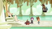 ZeitsprüngeHugo erklärt Ephi, Marcus und Ratrick (von l.) die neue Mission, bei der sie für Flaschengeist Balumba (r.) eine Wunderlampe besorgen sollen.Bild: © ZDF/Mondo TV France