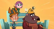 Die DebbingeIn einer Lore rasen Marcus (M.), Ratrick (l.) und Ephi (r.) durch den Stollen, Lumi (oben) freut sich.Bild: © ZDF/Mondo TV France