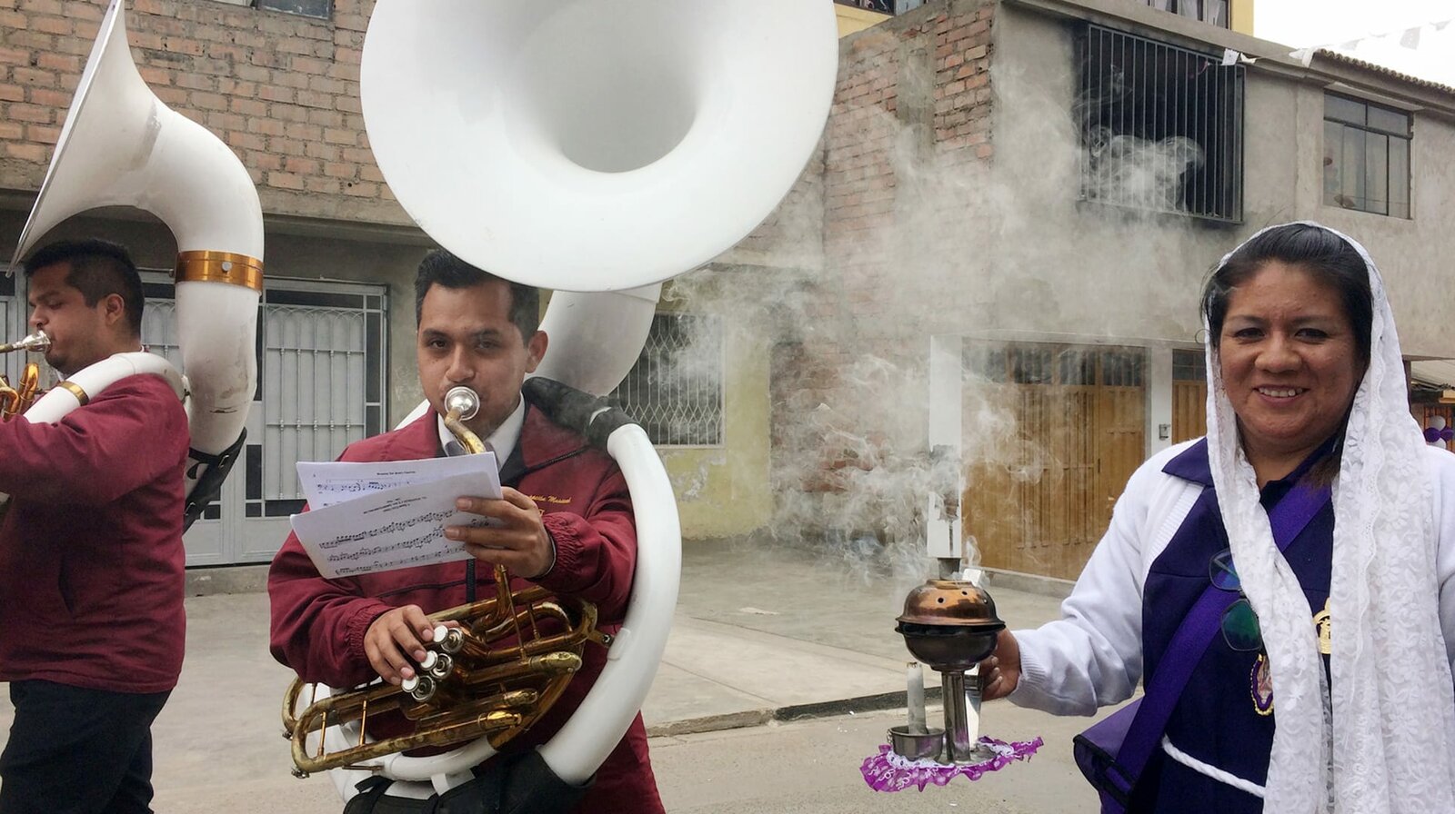 Peru - An der Küste der InkaAlltag im Stadtbild von Lima: Katholische Prozessionen mit Weihrauch und Blasmusik. Immer mit dabei ist Susaphon-Spieler Bruno Alvarado.Bild: © NDR/nonfictionplanet/Steffen Schneider