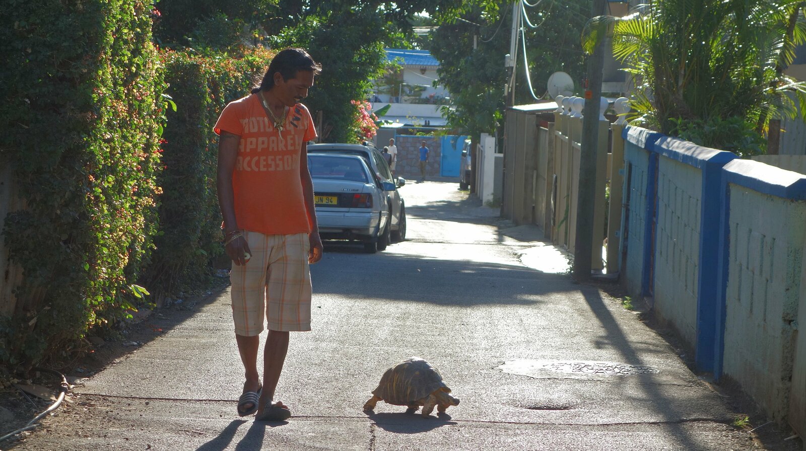 Mauritius - Paradies im Indischen OzeanGassi mit Lizzy: Vinesh Bandhoocha, der Chef der Modellwerft, geht Gassi mit seiner Schildkröte.Bild: © NDR/nonfictionplanet/Steffen Schneider