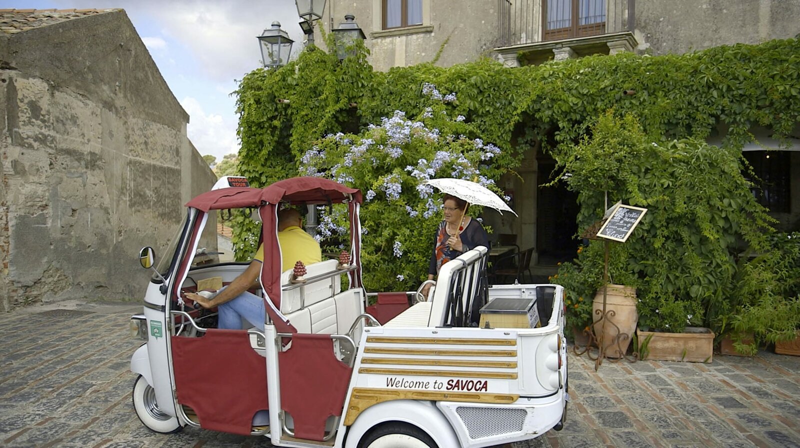 An Siziliens Ostküste - Rund um den ÄtnaIm Bergdorf Savoca kennt sie jeder: Signora Vincenza hatte im Filmklassiker "Der Pate" eine kleine Rolle neben Al Pacino. Heute bewegt sich die über 80-jährige am liebsten mit dem Ape-Taxi durch ihr Bergdorf.Bild: © NDR/nonfictionplanet/Florian Melzer