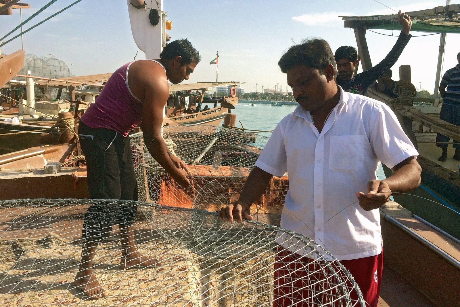 Abu Dhabi - Das Inselreich der ScheichsNDR Fernsehen MARETV, "Abu Dhabi - Das Inselreich der Scheichs", am Donnerstag (05.03.15) um 20:15 Uhr. Dhau-Kapitän Rameshbay Tandl zusammen mit Crewmitgliedern bei der Fertigung typisch arabischer Fangkörbe.Bild: © NDR/Till Lehmann