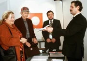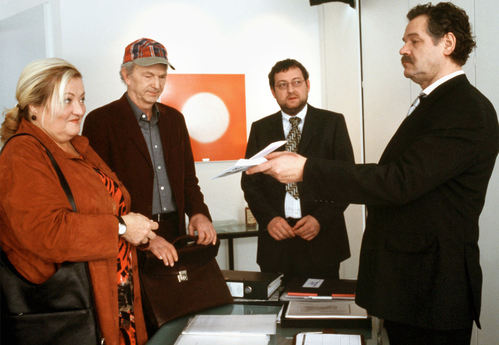 Marga Engel gibt nicht aufDie clevere Marga (Marianne Sägebrecht) und ihr Freund Henning (Michael Gwisdek, 2.v.li.) setzen den Baulöwen Ohrmann (Gunter Berger, re.) und seinen Anwalt Hähnel (Maximilian Krückl) unter Druck.Bild: © ZDF und ARD/Degeto/Sandor Domonkos