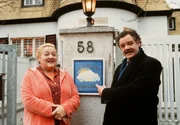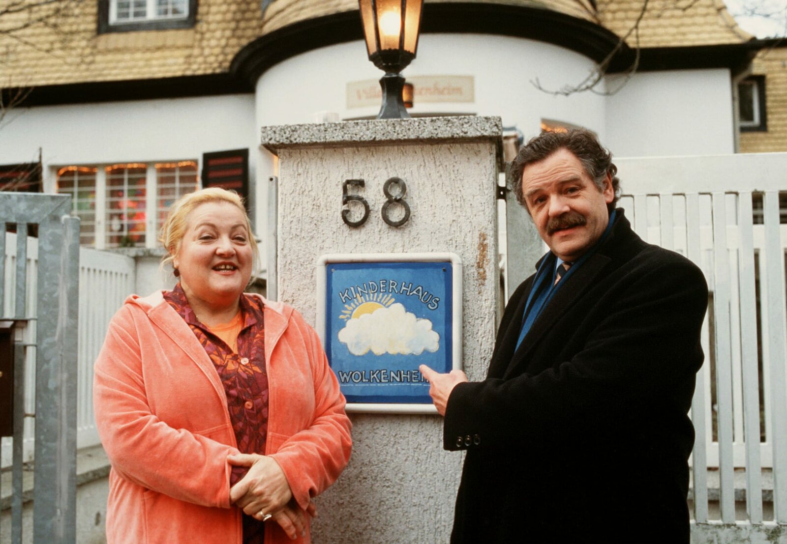 Marga Engel gibt nicht aufEr will rein, sie will nicht raus: Marga (Marianne Sägebrecht) und Ohrmann (Gunter Berger) vor der umkämpften Villa.Bild: © HR/Degeto/Sandor Domonkos